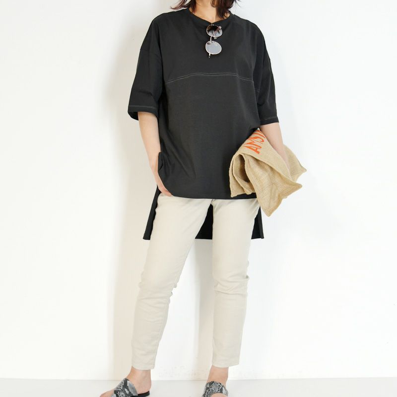 大胆にカッティングした前後差のあるスリット入りのシルエットによって、いつものカジュアルコーデをこなれて見せるおしゃれなチュニック。フロントとのみタックインのスタイルも様になりやすく、今っぽい抜け感を簡単に引き出せそう。季節の変わり目にちょうど良い半端な袖丈なので、夏から秋にかけたシーズンにおすすめ。ブラックのマニッシュなチュニックにナチュラルなベージュのスリムパンツを着こなして、柔らかな印象をミックス。シンプルコーデに映えるパイソンサンダルを履いて、洗練されたアーバンコーデを目指して。