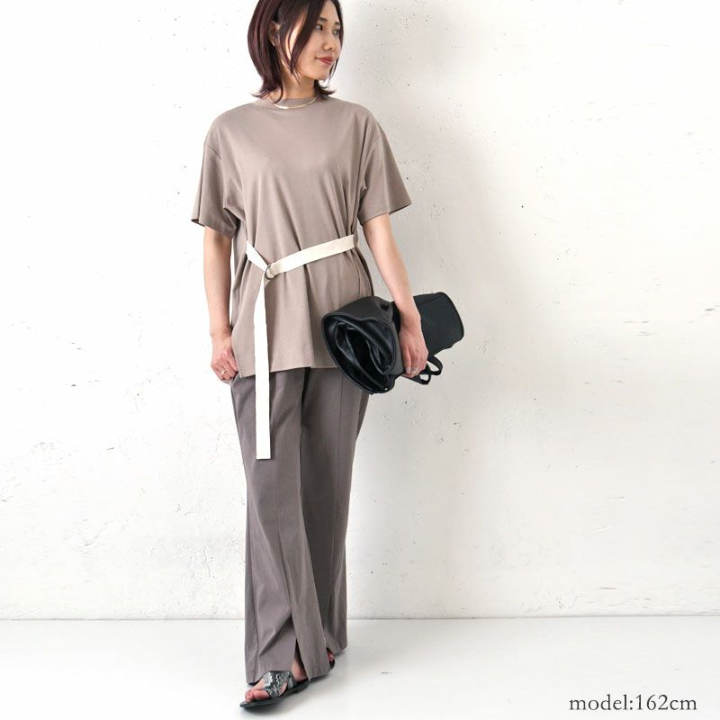 コットン素材を使ったカジュアルに着こなせるチュニックは、ロングシーズンで使える万能アイテム。秋になったアウターを合わせてインナーとしてもアレンジできますよ。ベーシックなデザインに配色ベルトをプラスして、身に着けるだけでも着映えするおしゃれなデザインが特徴的。ニュアンスのあるグレージュにブラウンのスリットパンツを着こなしたエクリュコーデで、大人のナチュラルなおしゃれを楽しんで。パイソン柄のサンダルをアクセントに、モード感をアップしましょう。