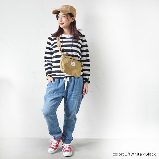 シンプルなクルーネックデザインのボーダーカットソーは、トレンドに関係なく着こなしができるのでワードローブあると重宝するトップス。程よく太めピッチのボーダーデザインが存在感を後押ししていて、一枚でも地味に見えない優れもの。デニム風のジョガーパンツを組み合わせたラフなスタイルで、スポーティーなアクティブなカジュアルコーデを作って。サコッシュとキャップをベージュでリンクさせて、統一感を演出。赤いスニーカーをポイントカラーに使うと、鮮やかさを高めたカジュアルコーデに。