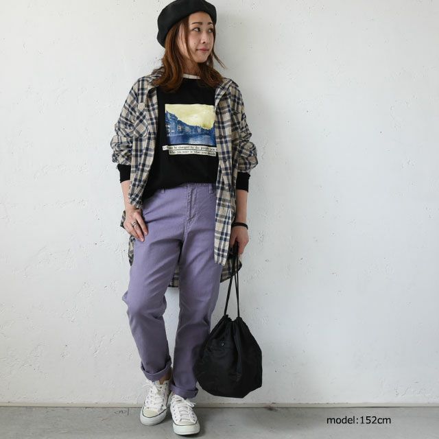 コットン素材を使ったベーシックなチェックシャツは、シーズンレスのコーディネートに合わせやすい万能トップス。ヒップラインが隠れるくらい前後差のあるロング丈なので、体型をカバーしてくれる嬉しい一面も人気のポイントに。パープル色のカラーパンツにブラックのプリントトップスを着こなした、抜け感のある大人カジュアルコーデ。チェックシャツを合わせたラフなスタイルで、親しみやすい装いに。ベレー帽で可愛らしいアクセントを添えて、おしゃれを格上げ。