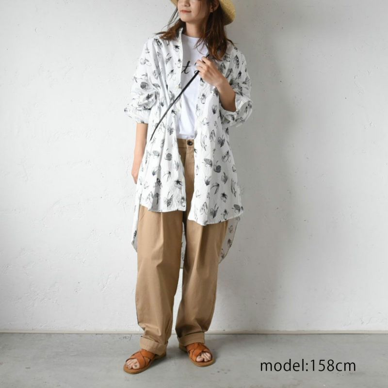 ルアー柄をモノクロで施したニュアンスのあるデザインで、いつものコーデを新鮮にアップデートしてくれるおしゃれなシャツ。前後差のあるゆったりとしたロング丈によって、体型カバーにも役立ってくれそう。ベージュのチノテーパードパンツを×白いロゴTシャツを着こなした、ナチュラルなカジュアルスタイルにルアー柄のシャツをオン。グッと存在感がアップして、ワンランク上のスタイルに。キャメル色のフラットサンダルを履いて、肩の力が抜けたおしゃれが完成。