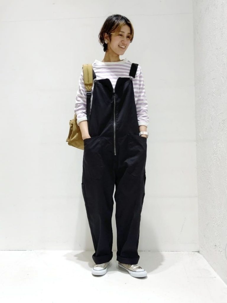 7分袖丈ボーダーカットソー×フロントジップオーバーオールコーデ