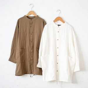 コットンリネン素材でオーバーサイズのデザインは、今の時期から羽織として大活躍します。
