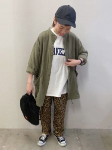 今回は、ロゴTとレオパードパンツのコーデにカーキのシャツアウターを。