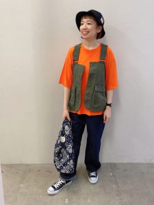 オレンジシャツとストレートパンツコーデに、カーキのハンディングベストを合わせてみました。