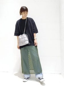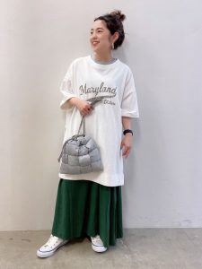 グリーンのギャザースカート×ビッグTシャツコーデ