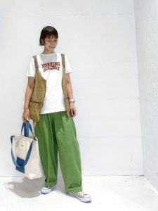 カーキのベスト×カラーTシャツメンズライクコーデ