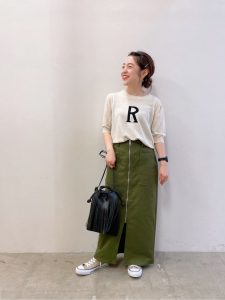続いては、カーキ・グリーンを使ったスカートの大人コーデです♪