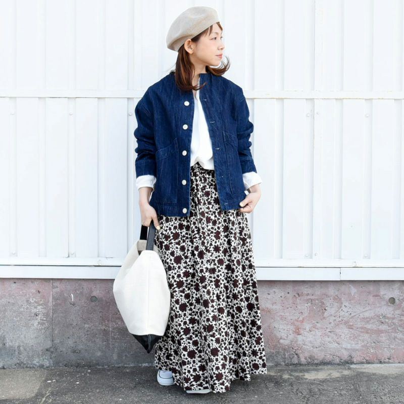 ワントーンで花柄をあしらったデザインで、大人がデイリーシーンに使いやすいおしゃれなロングスカート。どこかレトロなデザインがアクセントになり、大人のオフコーデに可愛い雰囲気を作ってくれそう。シーズン問わずに使えるコットン素材のスカートなので、一つあるとコーディネートのアレンジが広がりますよ。フェミニンなロングスカートにカジュアルなノーカラーデニムジャケットを羽織って、気負わないおしゃれにシフトチェンジ。ベレー帽を被って、フレンチルックなスタイルが完成。