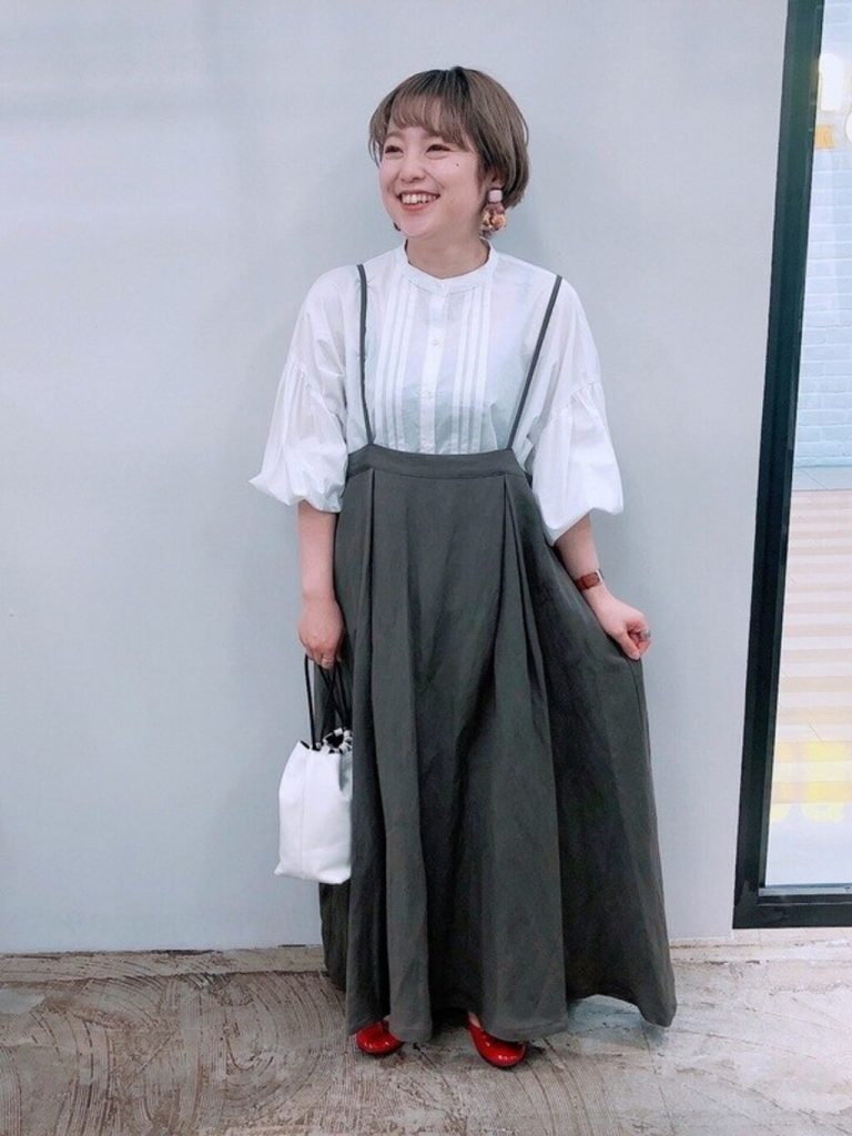 リネン×レーヨン素材を使っていて、滑らかな風合いを見せてくれる肌触りの良いロングフレアスカート。細めのストラップが華奢なイメージを作っていて、大人がきれいめな着こなしにも使いやすい一面も◎。ウエストに入ったタックデザインによって、お腹周りを目立たせない優れもの。白いピンタックブラウスを合わせたナチュラルなスタイルで、大人のクラシカルなイメージを引き出して。赤いバレエシューズを差し色に使って、大人可愛いおしゃれができあがり。