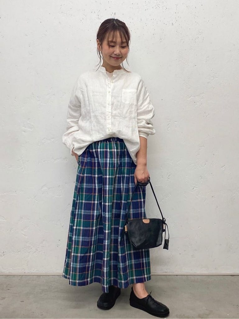 スタンドネックリネンシャツ×タックチェック柄スカートコーデ