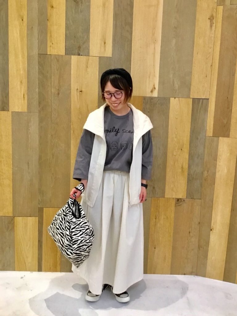ウエストラインにギャザーをたっぷりと使ったデザインによって、お腹周りを目立たせないロングフレアスカート。コットン素材を使っているので、シーズン問わずに使える万能ボトムス。クリーミーカラーの柔らかな色合いによって、大人の夏コーデを爽やかに演出。スカートと同カラーのビッグカラーベストを着こなして、トレンド感のある旬なおしゃれを叶えて。プリントトップスを覗かせたラフなコーデにゼブラ柄のバッグをアクセントに使って、スタイリッシュな秋スタイルが完成。