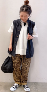 裾を絞レオパード柄のパンツと合わせると、トレンド感があっておしゃれなコーデに仕上がります。