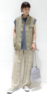先ほど紹介したブラックのベストの色違いで、ベージュ色のベストを使ったコーデです。
