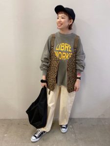 トップスのロゴのイエローカラーが、アニマル柄とマッチしてよりおしゃれに魅せてくれますね。