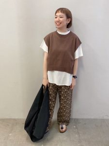 柄パンツとベストの色味を合わせて大人っぽさもプラス