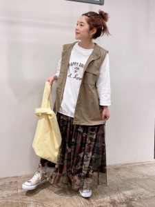 ボトムにはインパクトたっぷりの迷彩柄のロングスカートをチョイス。