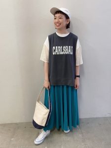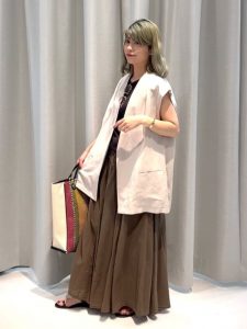 ロングスカートにTシャツといういつものスタイルに、ボリューム感のある長め丈ベストを合わせて、こなれ感たっぷりの着こなしを楽しみましょう。