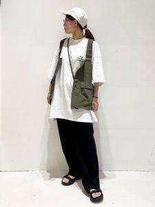 ビッグシルエットのTシャツにハンティングベストを合わせて、かっこいいスタイリングを楽しみましょう。