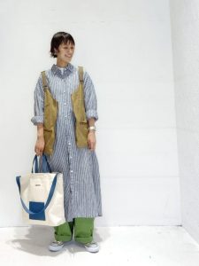 メンズライクな印象の強いフィッシングベストですが、意外とワンピースとの相性も抜群。