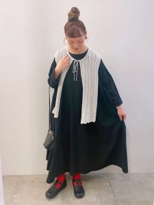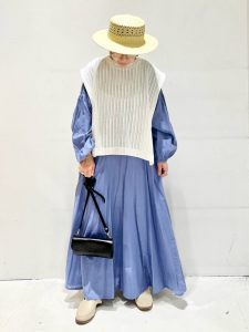 ボリュームたっぷりのワンピースにベストを合わせると、上半身がコンパクトになりすっきり着こなせます。