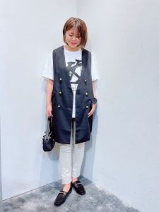 ベスト以外のアイテムをモノトーンにするのもおしゃれに魅せるポイントですよ。