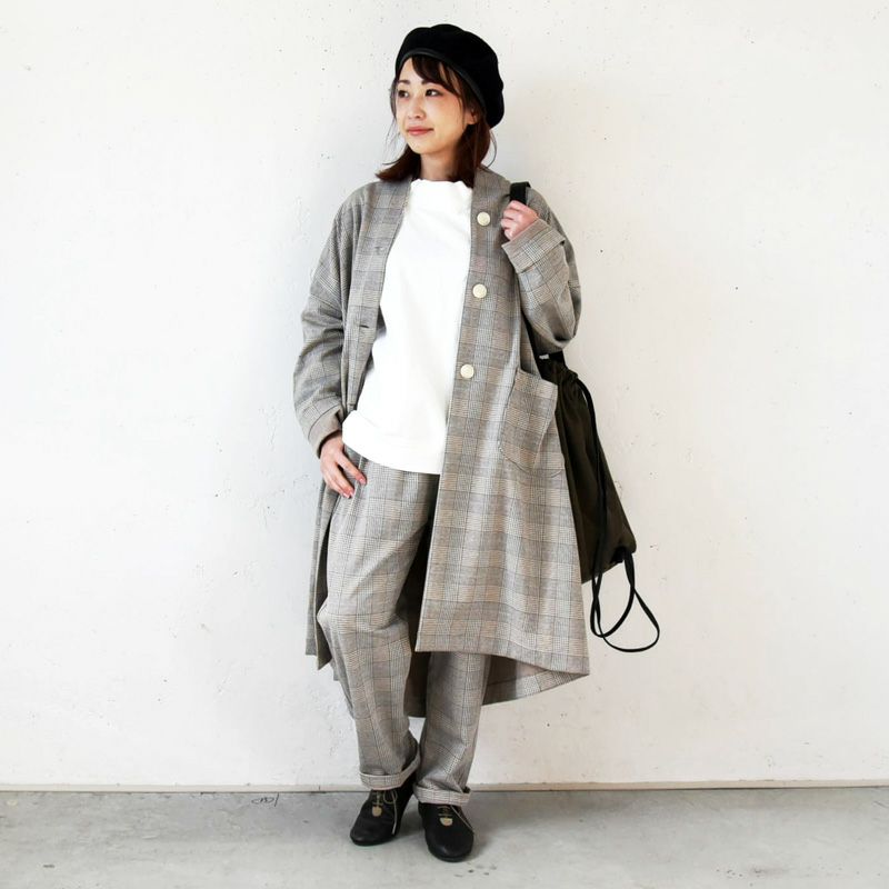 チェック柄コート×チェック柄テーパードパンツコーデ