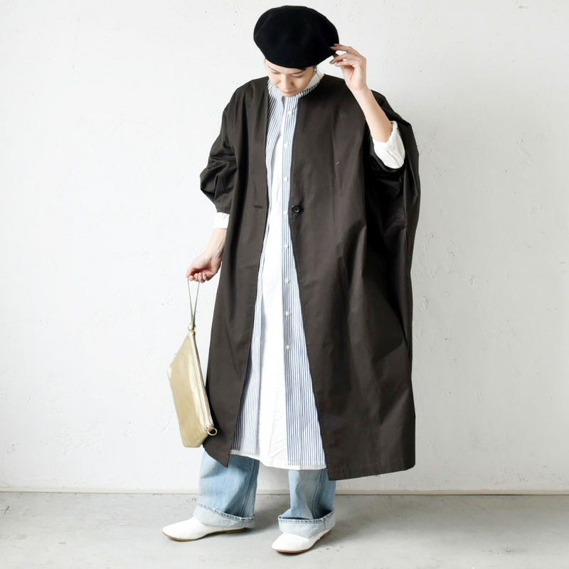 定番のトレンチコートをノーカラーとオーバーサイズで仕立てて、鮮度をアップしたアウター。バックに寄せたタックデザインや裾に向かってボリュームを持たせていて、シルエットに表情をもたらしてくれる存在感のあるコート。ナチュラルなアイボリー色コートを秋コーデに使うと、爽やかなおしゃれを狙えそう。同カラーのパンツをセレクトして、爽やかな大人のエクリュコーデを実現。モノトーンボーダートップスとベレー帽を組み合わせると、フレンチルックなカジュアルコーデのできあがり。