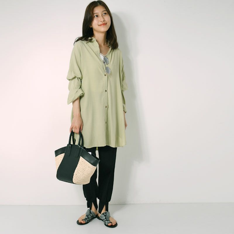 ゆとりのあるエアリーなフォルムのオーバーサイズシャツは、リラックスしたカジュアルコーデをメイクしてくれるトップス。ヒップラインが隠れるロング丈なので、体型カバーにもおすすめ。シーズンレスで使いやすいコットンベースに落ち感のある素材をミックスさせて、きれいめなコーデにもマッチする優れもの。カーキシャツにブラックのジョグパンツを着こなしたアクティブなスタイルで、こなれ感のあるスポーティーなおしゃれを実現。パイソン柄のサンダルを履いて、モード感をアップして。