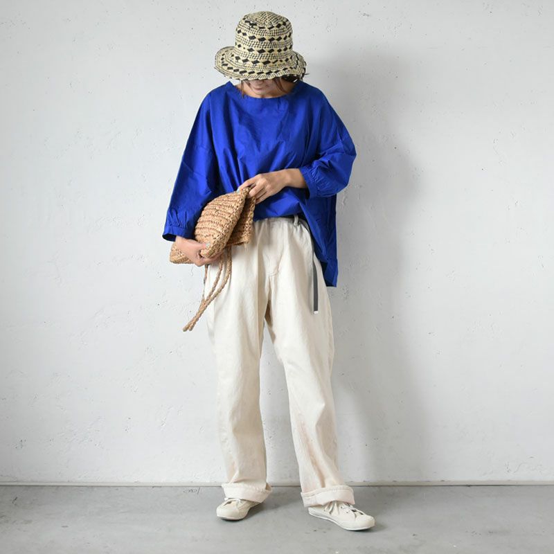 程よく開いたネックラインやバックに施したギャザーデザインによって、フェミニンさをメイクしてくれるオーバーサイズプルオーバー。長袖デザインのコットン素材を使っているので、秋のコーディネートにも着回しが効く万能な一面もポイントに。キリっとしたブルートップスにまろやかなオフホワイトのパンツを着こなして、清潔感のあるカジュアルコーデを叶えて。オリエンタルタッチな帽子をアクセントアイテムに使い、オリジナリティをアップしましょう。