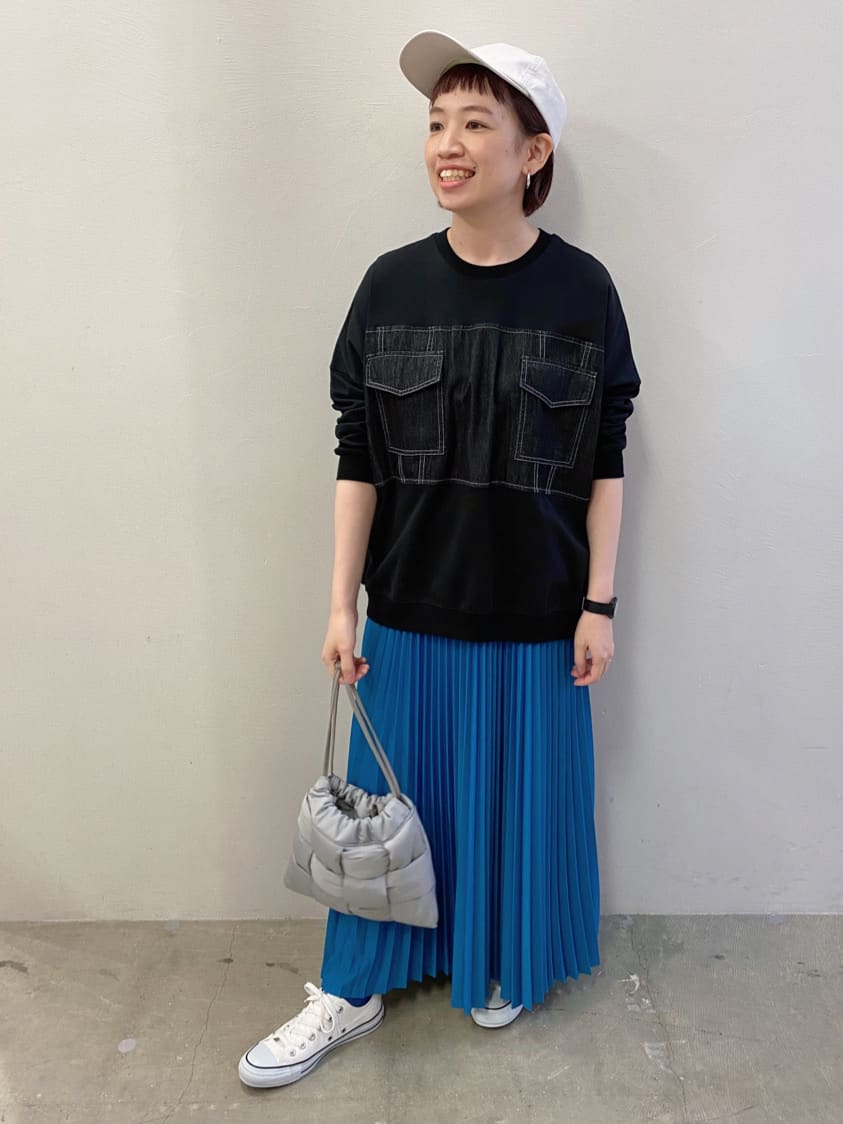 ブラックのプルオーバーに、ブルーのプリーツスカートを合わせた甘辛MIXコーデです。
