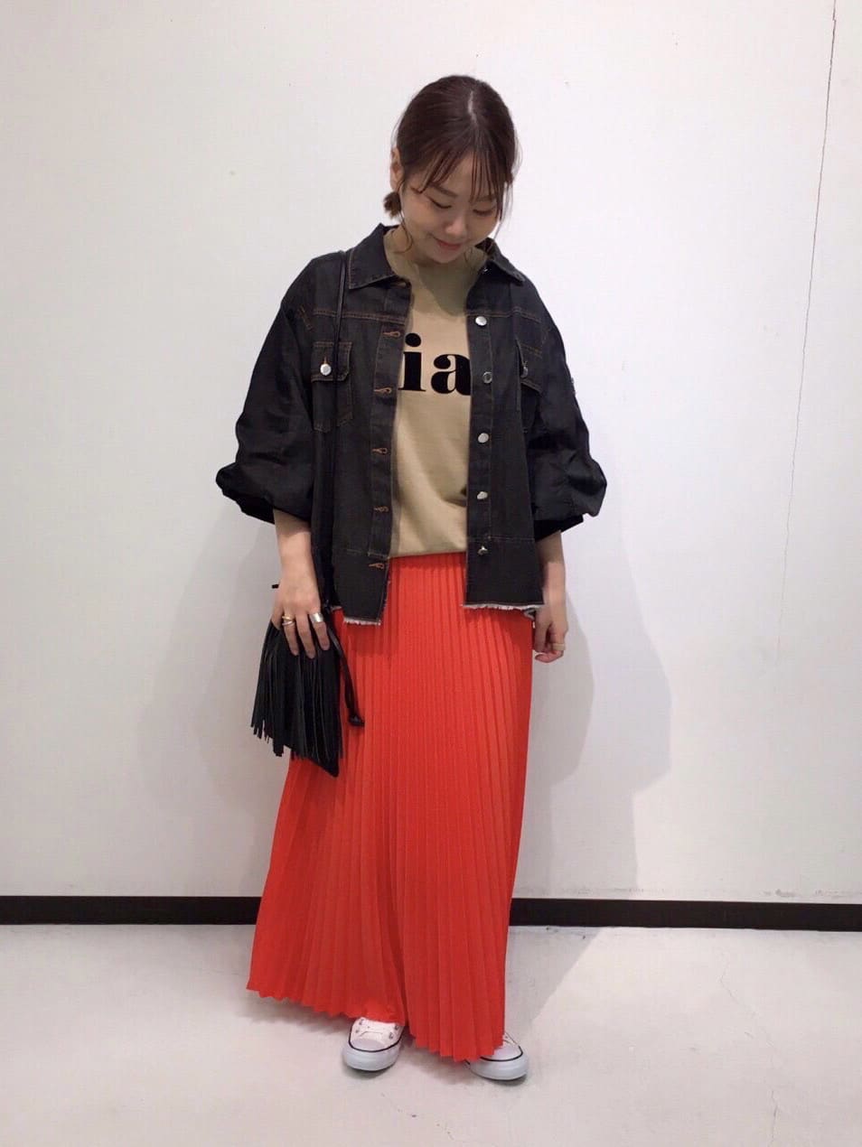 大きめのロゴにGジャンを羽織り、レッドのプリーツスカートを合わせたコーデです。