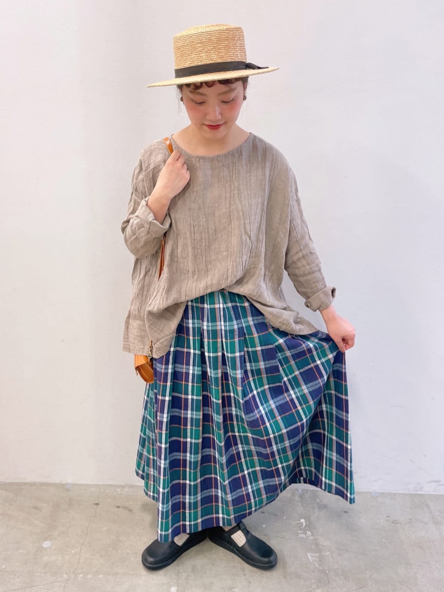 リネン素材のギャザーブラウスに、チェックのロングスカートを合わせたナチュラルコーデです。