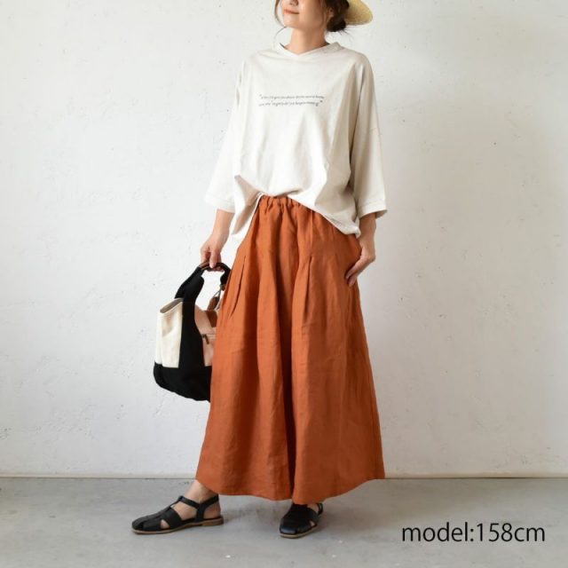 オレンジのロングスカートはリネン素材で、ナチュラルで温かみのある雰囲気を出してくれます。