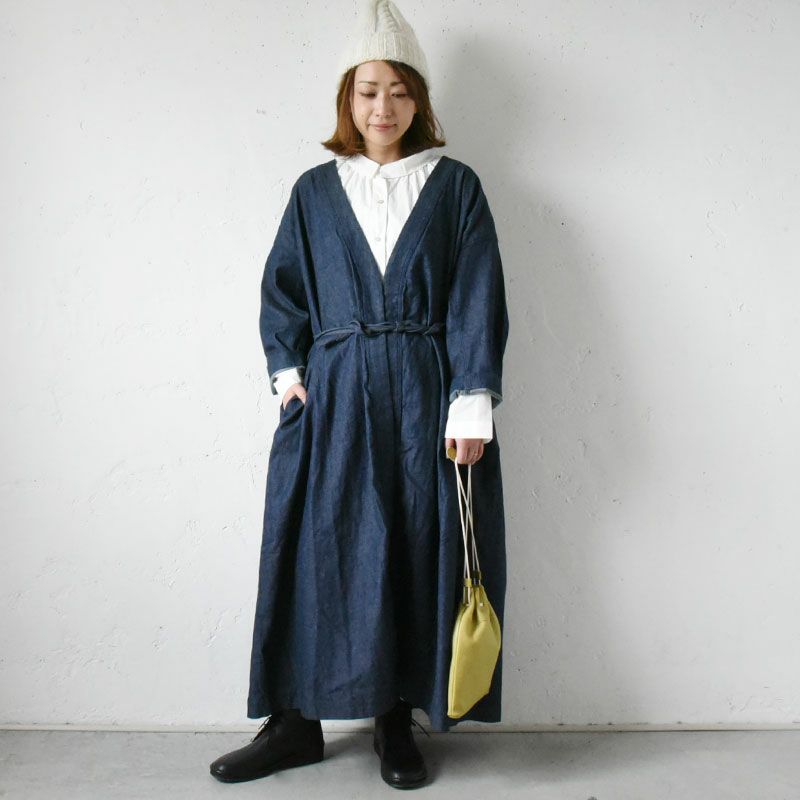 スッキリとしたボタンレスデザインのデニムトッパーカーディガンは、季節の変わり目に役立ってくれるアイテム。ウエストマークできるベルト紐が付いているので、コーデのアレンジを広げてくれる一面もポイントに。たっぷりとしたロング丈なので、体型カバーにも役立ってくれそう。Vネックノーカラーのデニムカーディガンにギャザーブラウスをレイヤードして、大人可愛くメイクして。シンプルにまとめたコーデに映える、イエローの巾着バッグを持って存在感をアップしましょう。