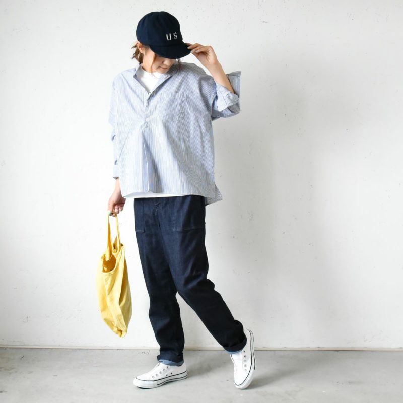 ヘンリーネックシャツ×ポケット付きストレートドデニムパンツコーデ