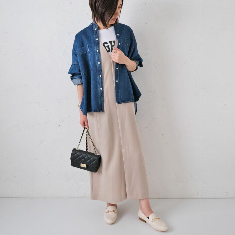 オーバーサイズデニムシャツ×ロングキャミワンピースコーデ