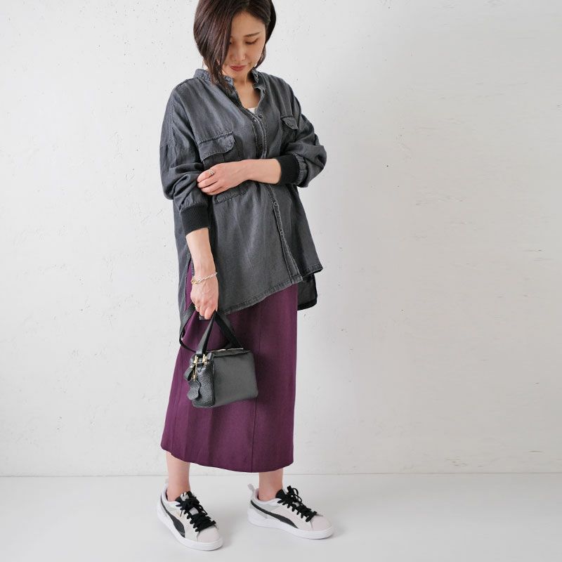 使い込んだような風合いと、前後差のあるシルエットによって大人の秋コーデをこなれて見せるデニムシャツ。落ち感のあるレーヨン素材を使っているので、カジュアルな中にも女性らしい印象を引き出せそう。主張しすぎないさり気ないバックロゴをあしらっていて、後ろ姿も抜かりなく演出。ブラックデニムシャツにパープルカラーのタイトスカートを合わせて、大人のシックなおしゃれを演出。スニーカーでラフに決めると、気負わない秋のスタイルができあがり。