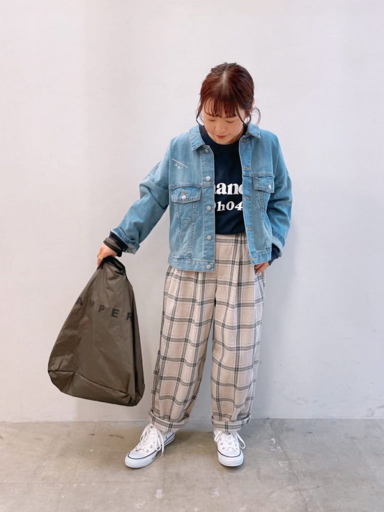 ベーシックデニムジャケット×チェック柄ワイドパンツコーデ