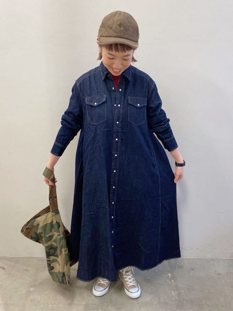 トレンドに左右されにくいデニム素材を使ったシャツワンピースは、大人のワードローブにあると重宝する定番人気アイテム。気温調整にもなる前開きデザインで、季節の変わり目にも役立ってくれそう。オーバーサイズがメンズっぽいニュアンスを付けて、リラックスしたカジュアルスタイルを演出。赤いトップスを覗かせて差し色に使うと、存在感をアップしたスタイルに。キャップとスニーカーを合わせたラフなコーデの仕上げに、カモフラ柄のバッグを持ってアーミールックなおしゃれを楽しんで。