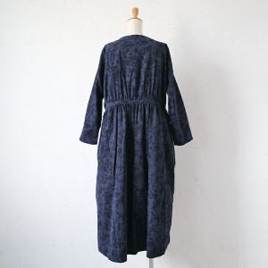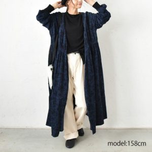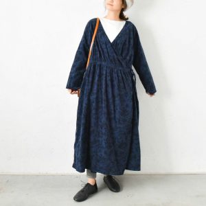 温もりのあるコーデュロイ素材を使っていて、秋冬コーデに使うだけでも季節感を盛り上げてくれるワンピースです。カシュクールやウエスト切り替えデザインになっているので、体型カバーを狙いたい時にも役立ってくれそうですね。前開きデザインで羽織り物としても着回しが効くので、秋冬のおしゃれの楽しみが広がりそうですね。ネイビーにワントーンでボタニカル柄をあしらっていて、秋冬のきれいめからカジュアルコーデまでテイスト問わずに使える万能アイテムです。