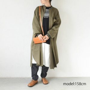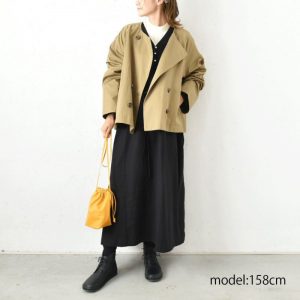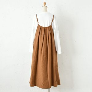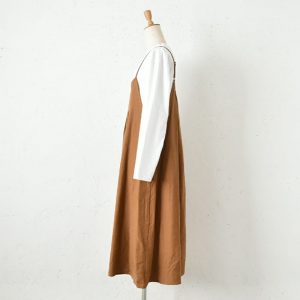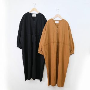 ウエストにドロストコードが通してあり、お好みのシルエットを演出できる人気のワンピース。スッキリとしたVネックラインやウエストを絞ったスタイルで、体型カバーを狙いたい時にもおすすめのアイテムです。リネンとコットン素材を使っているので、シーズンレスのコーデで役立ってくれる柔軟性のある一面もポイント。秋冬コーデにはインナーにハイネックやタートルネックニットを重ねたスタイルが様になりますね。キャメル・ブラックのベーシックなラインナップで、大人のデイリーシーンで役立つ万能な一着です。