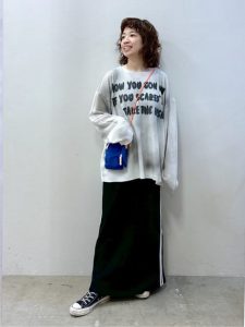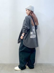 ゆったりシルエットが魅力のビックTシャツは、ラフな雰囲気とメンズライクなスタイルを楽しむことができるアイテムです。こちらのロゴTシャツは、インパクトのあるバックプリントが印象が的な1枚。ビッグシルエットのアイテムは、快適な着心地が魅力ですがスタイリングによってはルーズになってしまうのが悩みです。メリハリのあるコーディネートに仕上げることで、今っぽいスタイリッシュなスタイルを楽しむことができますよ。