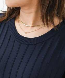 また、アクセサリーには長めのネックレスが選ばれており、縦のラインを強調してスタイルアップを図っています。