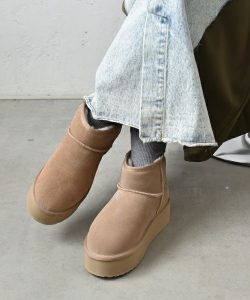 足元は厚底のブラックブーツで、全体のバランスを引き締めつつ、シンプルコーデにモード感を加えています。
