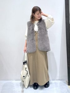 このワンピースに合わせて着用された「リバーシブルベスト」は、秋冬のレイヤードスタイルに最適なアイテムです。片面は毛足のあるフェイクファーで、コーディネートに柔らかさと暖かみを加え、もう一方はシンプルなデザインで、異なる印象を楽しむことができます。
