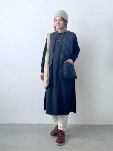 ワンピースは一枚で着てもおしゃれですが、ダウンベストを重ねることでカジュアル感が増し、全体の印象が引き締まります。