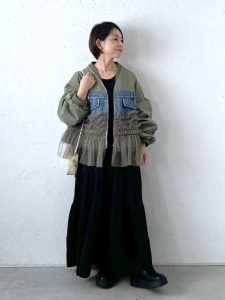 このコーディネートでは、オリーブグリーンのブルゾンがワンピースに軽やかさを与え、カジュアルな印象を際立たせています。