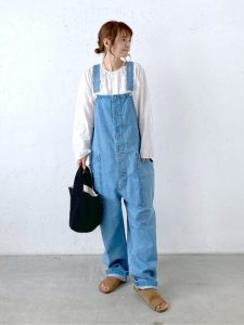 ゆったりとしたオーバーオールに合わせるのは、シンプルな白のブラウスで清潔感と上品さをプラス。