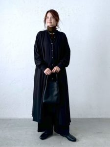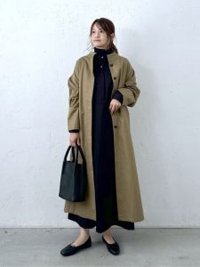 コートのシンプルなデザインは多くのアイテムと合わせやすく、今回のようにブラックのワンピースと組み合わせることで、モダンなモノトーンコーデを完成させます。